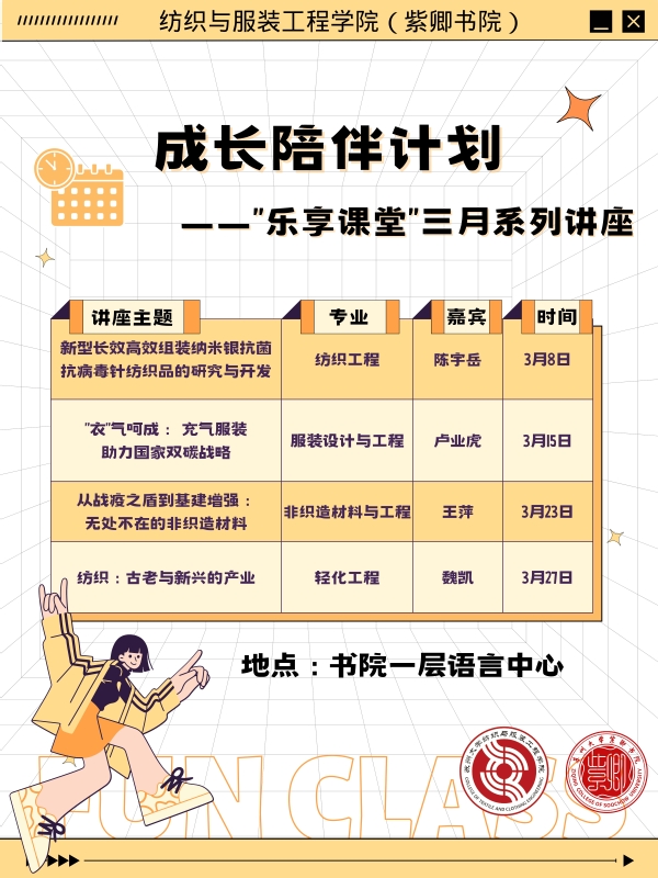 3月,纺织工程系陈宇岳教授、服装设计与工程系卢业虎教授、非织造材料与工程系王萍副教授以及轻化工程系魏凯副教授围绕《新型长效高效组装纳米银抗菌抗病毒针纺织品的研究与开发》、《“衣”气呵成 : 充气服装助力国家双碳战略》、《从战疫之盾到基建增强无处不在的非织造材料》、《纺织:古老与新兴的产业》做精彩分享。学业导师们分别从行业的发展、技术的革新、发展的动力、成果的应用等角度,深入剖析了专业前沿技术、行业发展前景,为新生学好专业做好启蒙,为坚定专业思想打下坚实基础。
