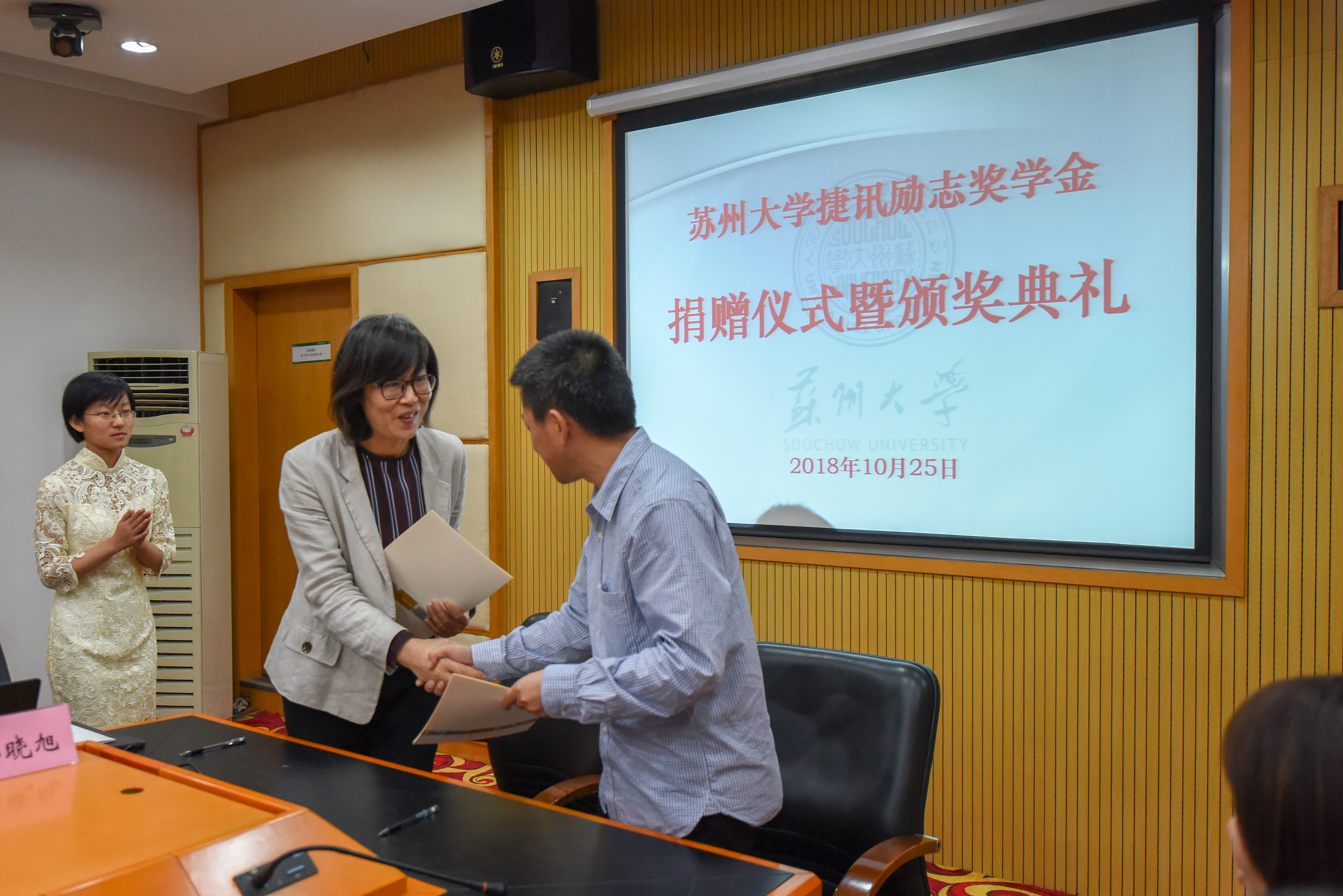 随后,钟卓志宣读了2018年苏州大学捷讯励志奖学金获奖学生名单,刘标和殷霆共同为获奖学生代表颁发荣誉证书。