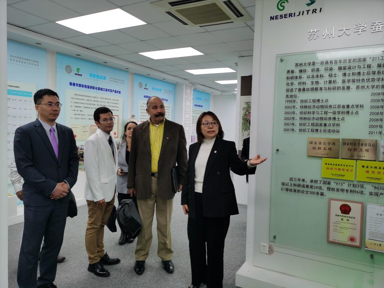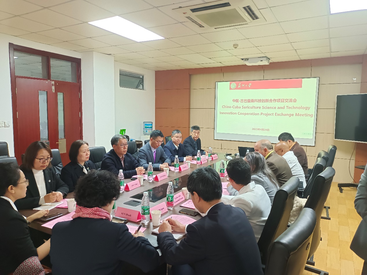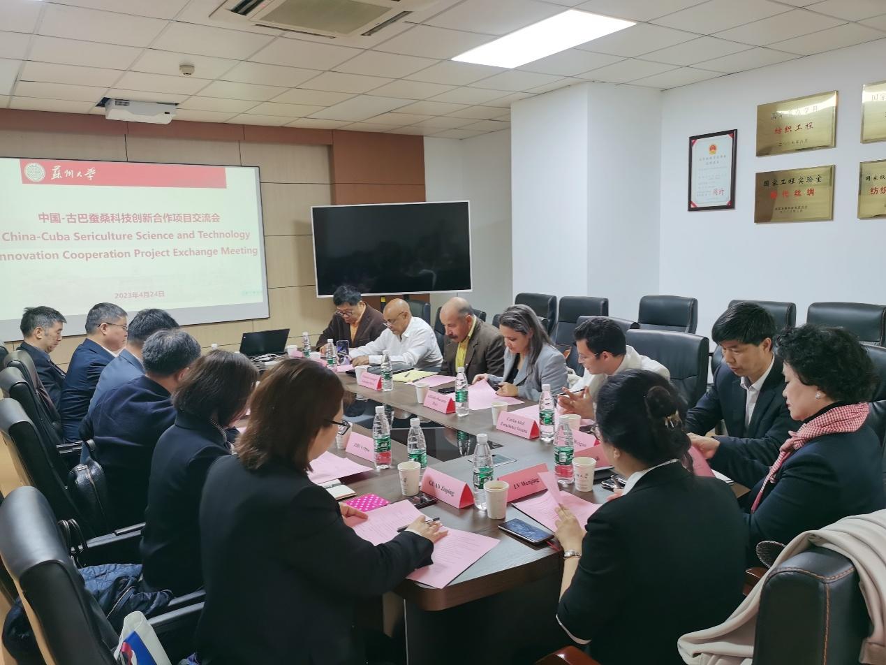 根据国家科技部重点计划政府间合作专项“中国-古巴蚕桑科技创新合作”项目任务安排, 4月24日,古巴共和国蛋白植物和生物产品研究中心副主任爱德华多阿尔卡赫先生为团长的古巴蚕桑代表团以及中古蚕桑科技合作中方负责人、联合国农业发展基金会蚕桑专家李龙一行8人访问苏州大学并召开了中国-古巴蚕桑科技创新合作交流会,会议在苏州大学现代丝绸国家工程实验室908号楼二楼2225会议室召开。校党委常委、副校长李孝峰,国际交流合作处、纺织与服装工程学院负责人、有关专家出席会议。