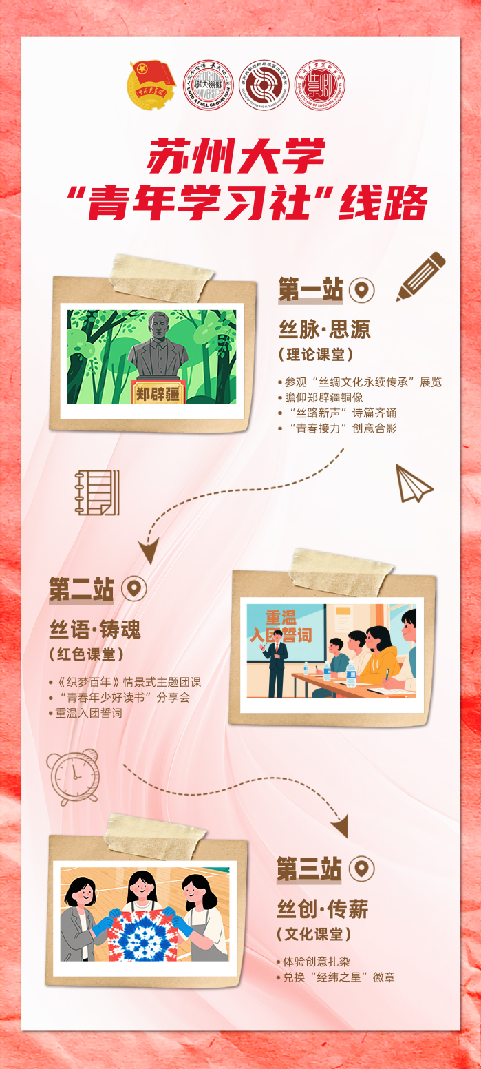 沈惠的殷切寄语,恰与当代青年积极投身传统文化传承的实践相呼应。就在今年5 月,由苏州大学团委与纺织与服装工程学院党委精心策划的 “青年学习社” 线路正式亮相,其核心立意与本次讲座主题不谋而合。这条线路以文化传承为脉络,以青春实践为载体,正是对 “将传统与现代相结合、勇担文化使命” 这一目标的积极回应,为青年学子搭建起了一座从理论认知到实践探索的桥梁。该线路以“经纬织就青春路 知行合一启新程”为主线,串联起 “丝脉・思源”“丝语・铸魂”“丝创・传薪” 三大学习站点,通过走观式探访、沉浸式展演、体验式实践等形式,为青春解锁理论学习新路径。