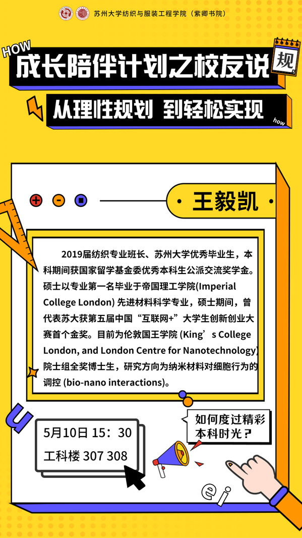 5月10日下午,纺织与服装工程学院(紫卿书院)2019届毕业生王毅恺为学院本科生做题为“如何度过精彩本科时光——从理性规划到轻松实现”的分享,讲座由学院学工办主任季彦斐主持。