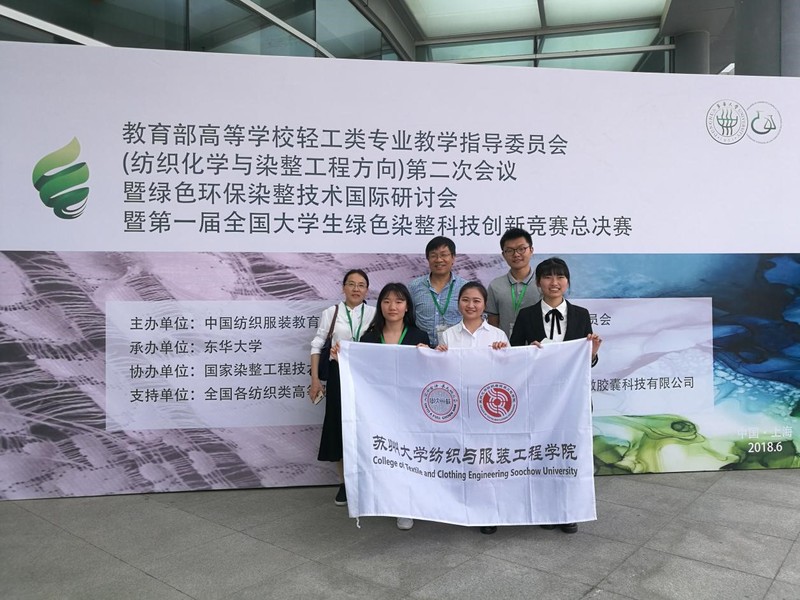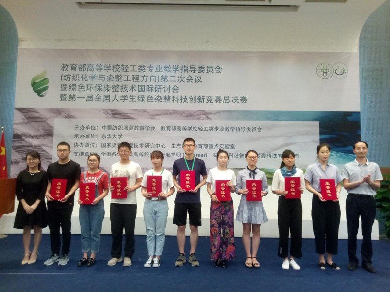 2018年6月7日至8日,首届全国大学生绿色染整科技创新竞赛总决赛在东华大学松江校区顺利举行,教育部高等学校轻工类专业教学指导委员会(纺织化学与染整工程方向)第二次会议暨绿色环保染整技术国际研讨会也同期举办。中国纺织教育学会会长倪阳生,东华大学副校长卿凤翎、舒慧生,教育部高等学校轻工类专业教学指导委员会副主任委员、国家染整工程技术研究中心主任阎克路,教育部高等学校轻工类专业教学指导委员会秘书长、四川大学轻纺与食品学院院长何有节,以及来自全国30多所纺织类高校和高职院校的领导和专家出席活动,来自全国各高校的32支参赛队伍及指导教师等百余人参加大赛。其中,我院副院长王祥荣老师,轻化工程系副主任邢铁玲老师出席本次研讨会。