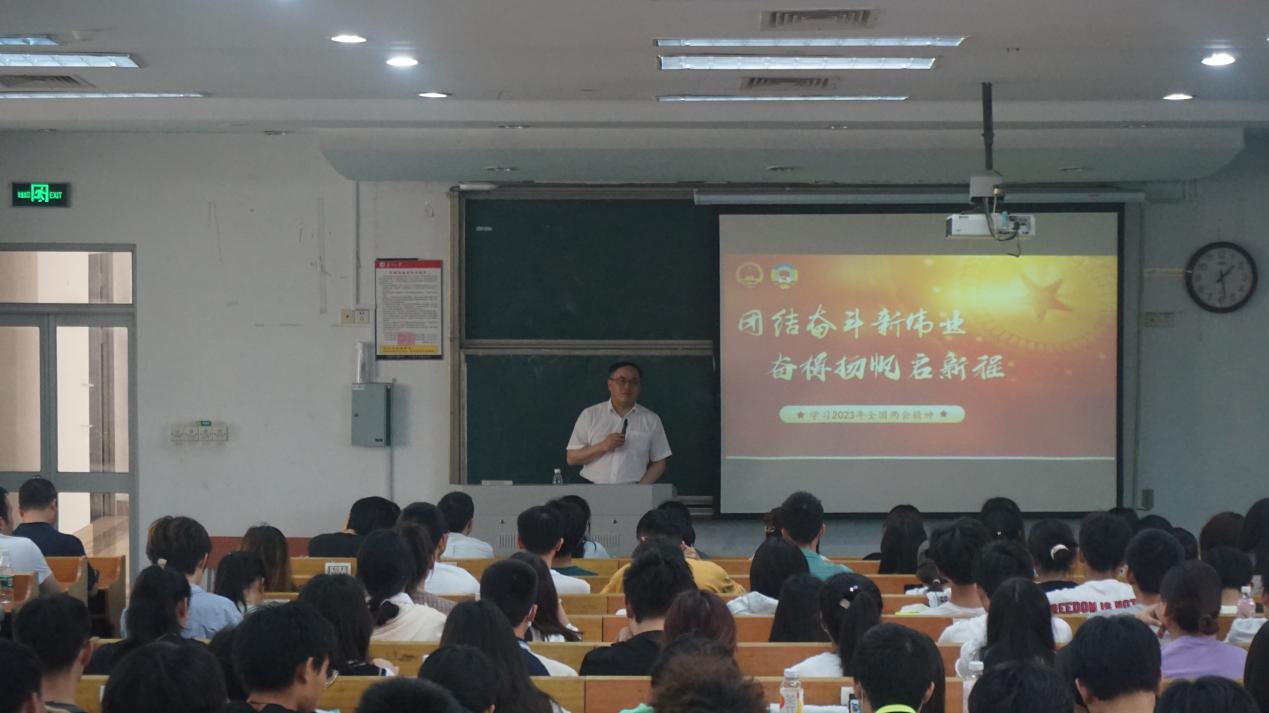 2023年5月31日下午,校党委常委、纪委书记、监察专员宫向阳为纺织与服装工程学院2022级全体本科生、学生党员、青马工程学员讲授题为“团结奋斗新伟业,奋楫扬帆启新程”的形势与政策课,课程由学院党委书记肖甫青主持。