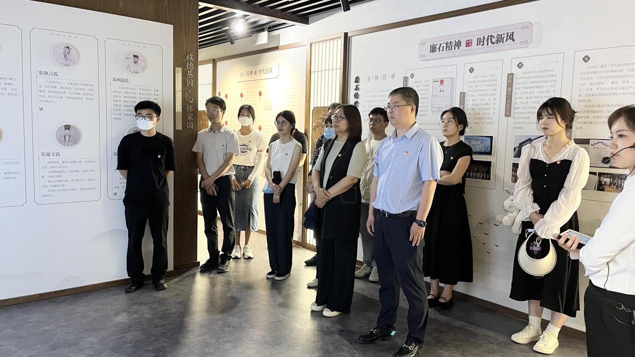 在解说员的带领下,全体党员参观了名人文化廊和陆公馆,现场生动的文字、图片和声光影等技术为大家带来了一场沉浸式的廉石文化学习。名人文化廊主要展示了孙武、范仲淹、范成大等众多贤官廉吏的勤廉事迹。陆公馆主要讲述三国廉吏陆绩的生平事迹、家风家训及精神传承,记载了陆绩孝廉忠正、德颂郁林、载石还乡、归葬阳山等历史故事。全体同志在“走听看思悟”中筑牢廉洁文化根基,学习了“廉石精神”,领会了立政德的重要性,立志要做到明大德、守公德、严私德。