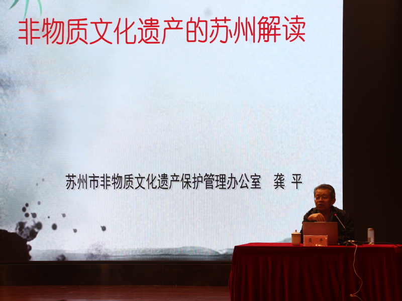 龚平从非物质文化遗产、苏州的非物质文化遗产、当前苏州的非物质文化遗产传承、创新与利用的问题三个方面进行了全面的刨析。作为一名老苏州,龚平结合自己的经历重点讲解了非遗的七个基本特点和苏州非遗的四个特点,并以苏州园林这一文化遗产及昆曲等多项非遗为例向同学们展现了非遗的重要性和价值,使同学们深刻了解苏州非遗在全国乃至世界中的地位和影响力。他强调,非遗要融入社会,要融入年轻人之中,不能脱离生活,年轻人的参与会使非遗的传承和发展更具意义。