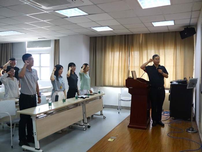 重温入党誓词,铭记初心使命。肖甫青带领全体党员面向党旗重温入党誓词,关晋平向新党员赠送了《中国共产党章程》。