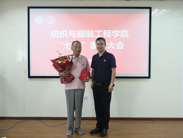 甄勇宣读纺织与服装工程学院优秀共产党员、优秀党务工作者、先进基层党组织表彰名单。肖甫青为“两优一先”获表彰代表颁奖。
