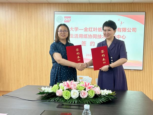 2023年6月13日上午,“金红叶纸业集团有限公司--苏州大学生活用纸协同技术创新中心”签约暨揭牌仪式在苏州大学北校区工科楼422会议室举行。校科学技术研究院院长徐小乐、纺织与服装工程学院党委书记肖甫青、副院长关晋平、孟凯副教授与赵荟菁教授研究团队、金红叶纸业集团有限公司公关总经理王英、研发总监黄锦华等嘉宾出席。仪式由关晋平主持。