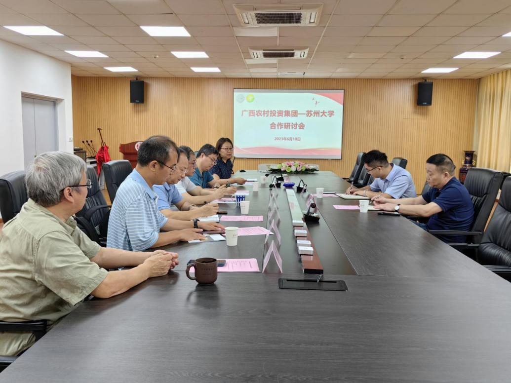 6月18日上午,广西农村投资集团有限公司协同合作部石宏平部长和广西农投时宜农业科技有限公司陈国民总经理来我院洽谈合作,学院党委书记肖甫青、院长张克勤、副院长关晋平和副院长严俊、苏州医学院徐世清教授等出席会议。