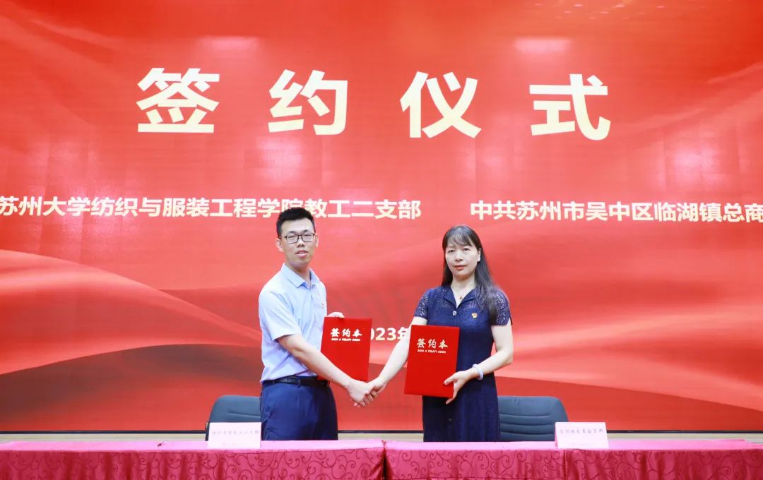纺织与服装工程学院教工第二党支部张岩与临湖镇总商会党支部陈永君签署共建协议。