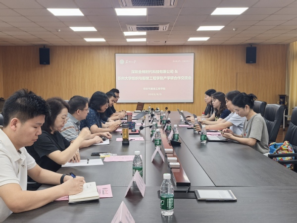 2025年9月5日,深圳全棉时代科技有限公司与苏州大学纺织与服装工程学院产学研合作交流会在苏州大学天赐庄校区北校区召开。深圳全棉时代研发经理宋青粉及其研发团队,苏州大学纺织与服装工程学院副院长关晋平及相关领域专家教授出席了本次会议。会议由关晋平主持。