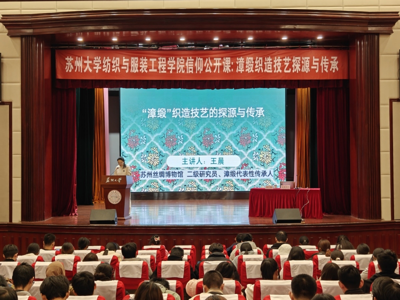 2024年11月28日晚,“漳缎织造技艺探源与传承”——苏州大学纺织与服装工程学院“信仰公开课”院级示范课在天赐庄校区本部敬贤堂举行。苏州丝绸博物馆二级研究员,漳缎代表性传承人王晨担任主讲嘉宾。纺织与服装工程学院“青年马克思主义者培养工程”学员、2024级本科生、研究生参加。活动由李雪主持。