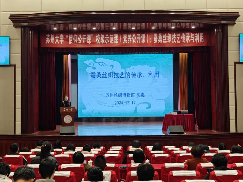 2024年12月17日晚,“蚕桑丝织技艺传承与利用”——苏州大学“信仰公开课”校级示范课(素养公开课)在天赐庄校区本部敬贤堂举行。苏州丝绸博物馆原副馆长、研究员级高级工程师、国家级非物质文化遗产项目宋锦织造技艺代表性传承人沈惠担任主讲嘉宾。苏州大学团委副书记徐娜,纺织与服装工程学院党委副书记、副院长虞岚,学院团委书记孙晓旭出席活动。2024年苏州大学“青年马克思主义者培养工程”秋季班学员、纺织与服装工程学院“青年马克思主义者培养工程”学员、2024级本科生、研究生参加活动。