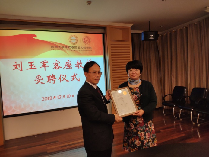首先,由潘志娟宣读“关于聘请刘玉军教授为苏州大学客座教授的批复”并为刘玉军颁发聘书,聘期三年(2018年9月-2021年9月)。