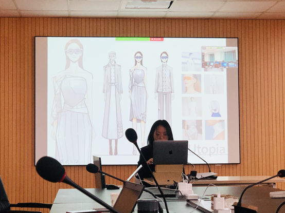 双方学生以小组为单位按照交替顺序进行项目汇报。语言的阻隔没有阻碍想法的交流,双方全程采用英文汇报,畅想百年后的时尚产业以及服装的变化。在未来的自然和社会环境演变、经济结构的变化、可持续进程和科学技术的进步(例如人工智能,新型材料)等方面,双方学生都发表了自己独特的见解并将之与时尚结合分析,构想了全新的产业结构或独创性服装。此外,汇报后的问答环节,双方导师也指出了学生分析的不足并提出了相应的建议。
