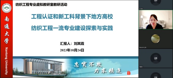 2023年10月24日下午,纺织工程专业虚拟教研室教学研讨会在虚拟教研室工作平台如期举行。本次活动邀请南通大学刘其霞教授,以“工程认证和新工科背景下地方高校纺织工程一流专业建设探索与实践”为题进行主题汇报,来自苏州大学、江南大学、浙江理工大学、南通大学、上海工程技术大学、绍兴文理学院、常熟理工学院、盐城工学院等8所高校的30余位教师参加了活动。活动由苏州大学纺织与服装工程学院副院长陈廷教授主持。