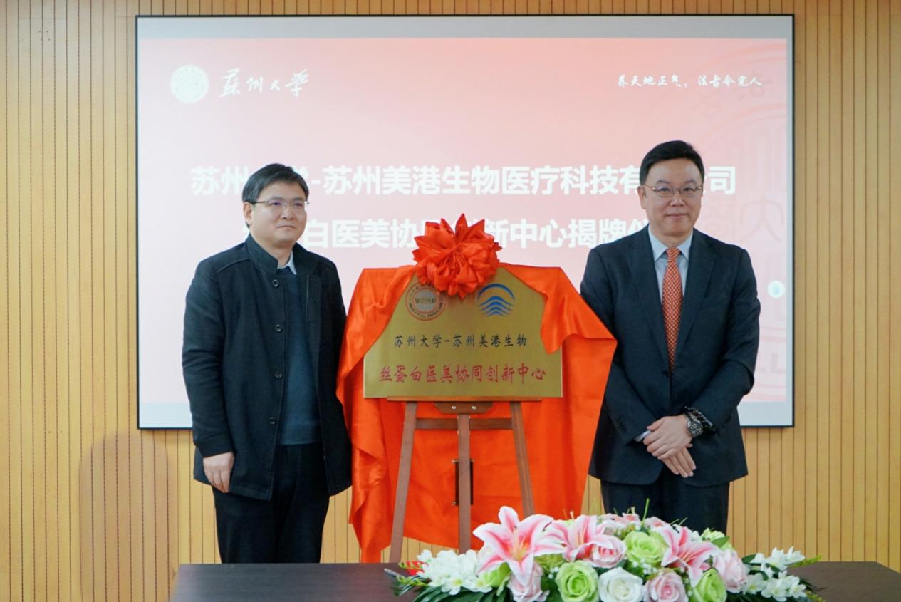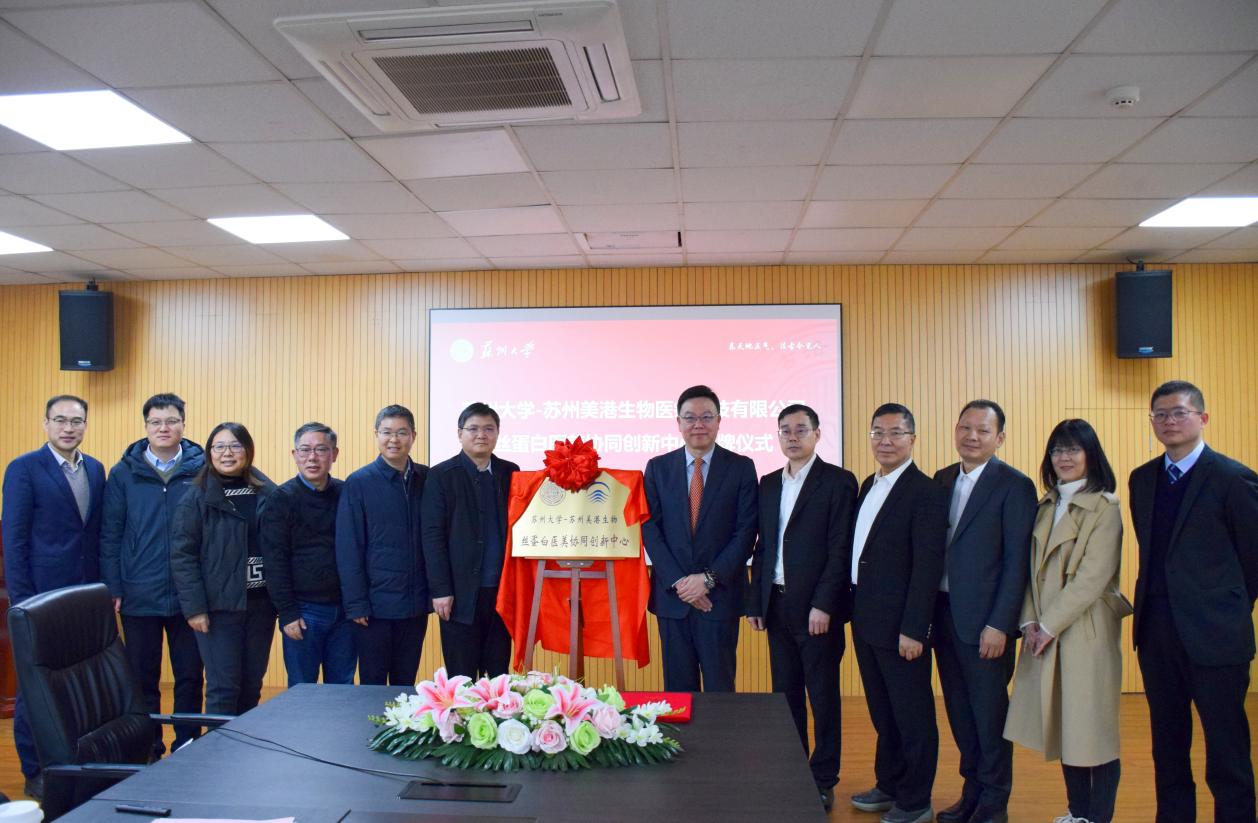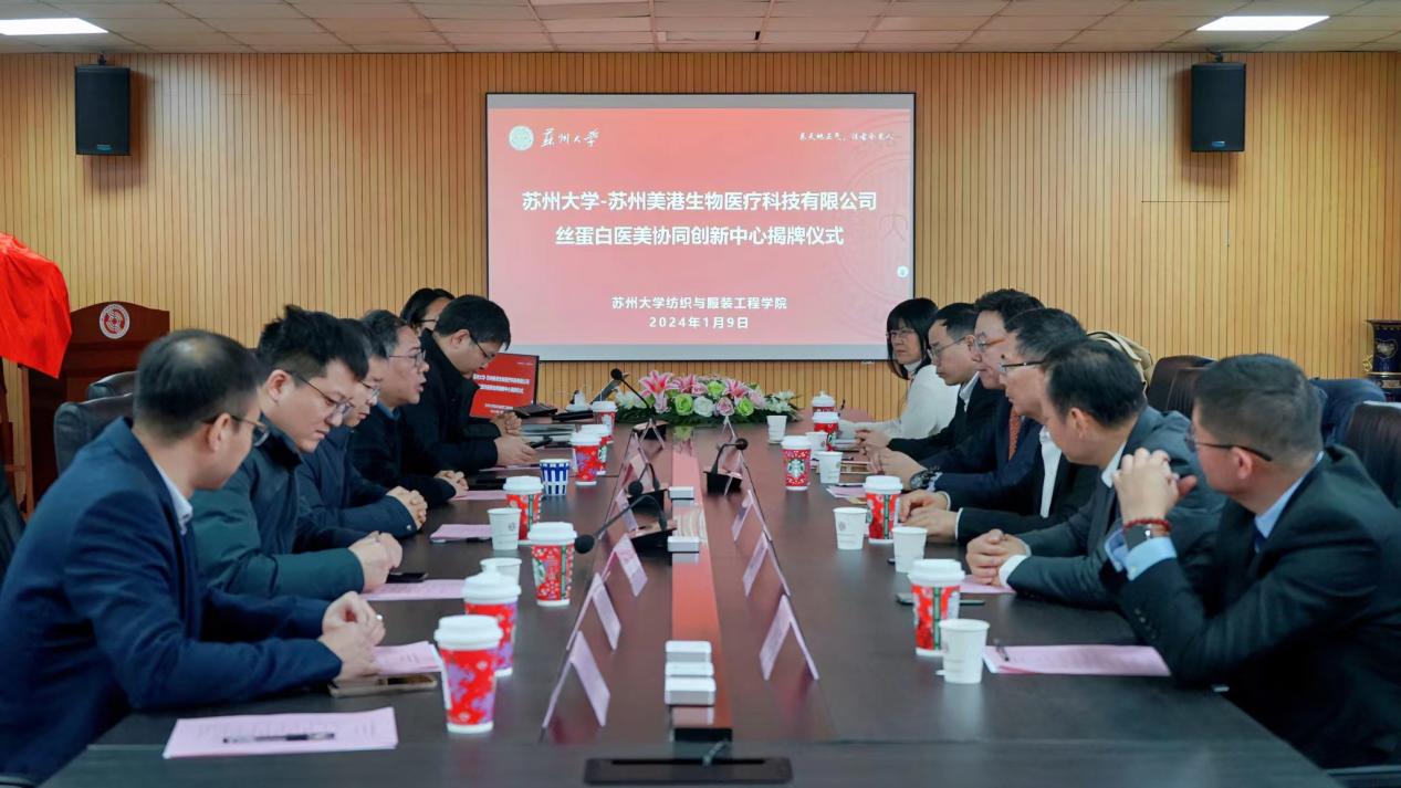 2024年1月9日上午,苏州大学-苏州美港生物丝蛋白医美协同创新中心签约授牌仪式圆满举行。苏州大学科学技术研究院副院长刘开强、协同创新管理办公室主任张浩、苏州大学纺织与服装工程学院党委书记肖甫青、院长张克勤、副院长关晋平、副教授郑兆柱,苏州美港生物医疗科技有限公司董事长刘卫荣、总经理张国庆等人出席了签约授牌仪式。仪式由肖甫青主持。