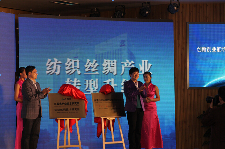 2015年11月9日下午,由南通市科技局、南通国家高新区、南通纺织丝绸产业技术研究院共同举办的“纺织丝绸产业创新创业专场”活动暨江苏省产业技术研究院纺织丝绸技术研究所(南通纺织丝绸产业技术研究院)揭牌仪式在南通高新区隆重举行。中国工程院院士姚穆、蒋士成、俞建勇,南通市副市长黄爱军,南通大学校长程纯,苏州大学副校长路建美、江南大学副校长高卫东,浙江理工大学副校长陈建勇,东华大学服装学院院长李俊,江苏省产业技术研究院项目总监庄韦,我校科技产业处副处长糜志雄,纺织与服装工程学院领导及产业技术研究院纺织丝绸技术研究所团队负责人以及来自北京、上海和南通等地的40多家投资机构受邀参加了此次活动。共同为纺织丝绸技术研究所揭牌。