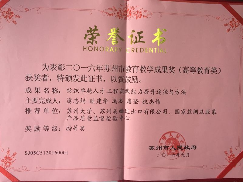苏州市首届教育教学成果奖评审落下帷幕,我院申报的《纺织卓越人才工程实践能力提升途径和方法》获得高等教育类特等奖,该项目是苏州大学在此次评审中获得的唯一特等奖。