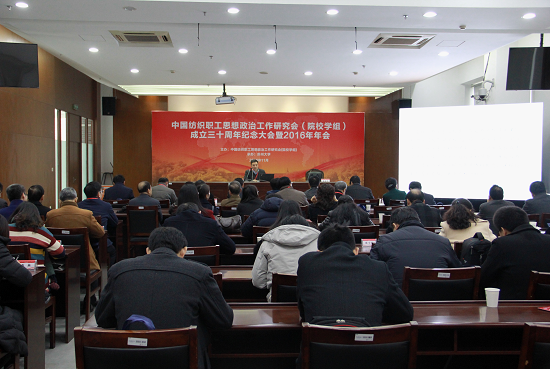11月25日,中国纺织职工思想政治工作研究会(院校学组)成立三十周年纪念大会暨2016年年会在我校王健法学院举行。中国纺织服装教育学会会长倪阳生,天津工业大学党委书记张宏伟,原研究会会长、原北京服装学院党委副书记杨绍文,现任研究会会长、北京服装学院党委副书记倪赛力,我校党委副书记、副校长江作军,以及来自东华大学、浙江理工大学、西安工程大学、武汉纺织大学、南通大学等全国各地高校60余名代表和我校相关职能部门负责人出席了大会。开幕式由我校党委宣传部部长、新闻中心主任陈进华主持。