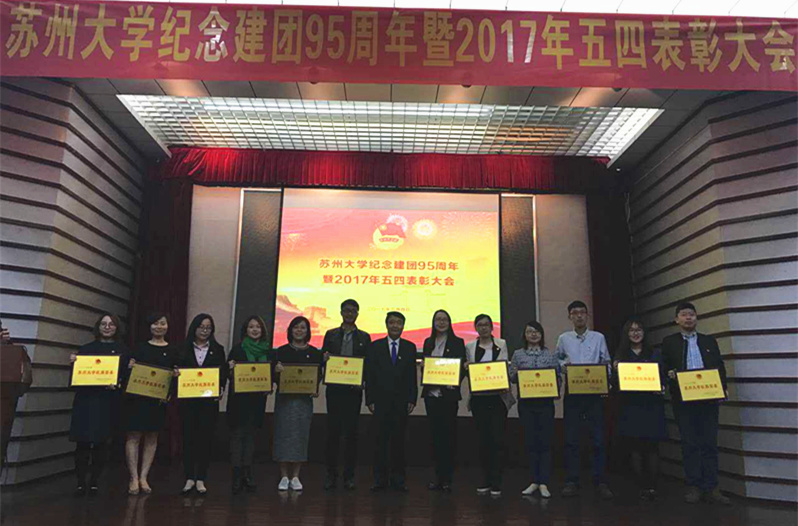 2017年5月4日下午,苏州大学庆祝中国共产主义青年团成立95周年暨2017年五四表彰大会在本部红楼会议中心学术报告厅召开。我院团委在2016年苏州大学红旗团委遴选中脱颖而出,荣获“2016年度苏州大学红旗团委”称号,同时2016级纺织国际团支部获“2016年度苏州大学十佳红旗团支部”称号,2015级轻化工程团支部获“2016年度苏州大学红旗团支部”称号,冯佳文等12名同学获“2016年度苏州大学优秀共青团员”称号,毛莉等3名同学获“2016年度苏州大学优秀共青团干部”称号。