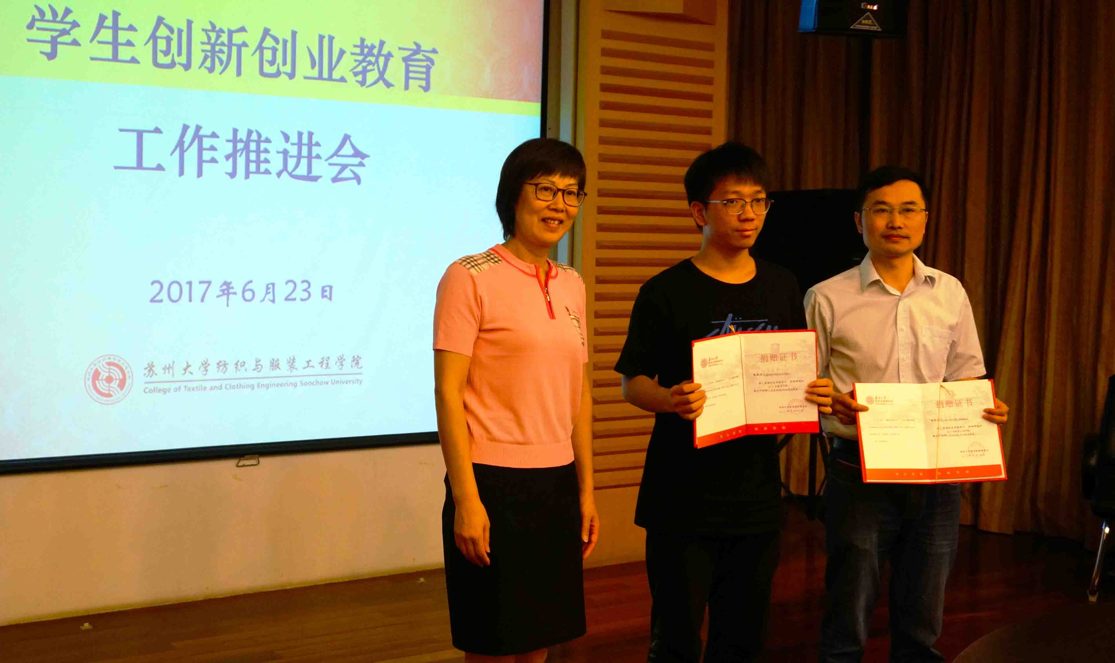 推进会上举行了纺织与服装工程学院大学生创新创业基金成立仪式。校发展委员会办公室赵阳主任为捐赠者颁发了捐赠证书。该基金的首批捐赠来自于苏州光威纳米科技有限公司创业团队和1990级校友,捐赠代表学院2017届毕业生、轻化工程专业程维俊同学作了发言。