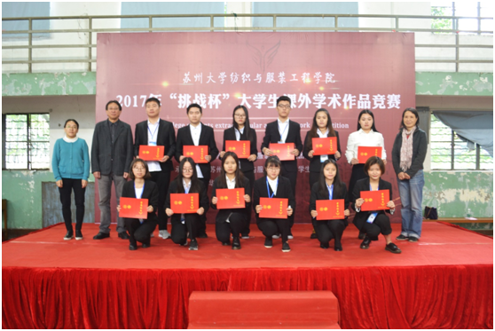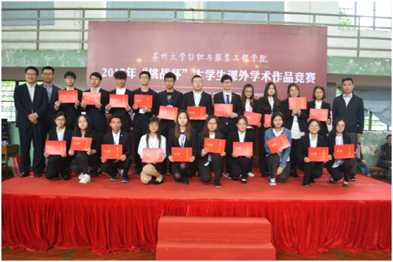 在紧张的答辩环节结束后,结合答辩汇报和书面审评,最终4组团队斩获了特等奖,6组团队赢得了一等奖,12组团队赢得了二等奖,23组团队获得三等奖,另有3组团队获得了单项奖。学院领导及评委老师为获奖的队伍颁奖并和获奖团队合影留念。本次竞赛中涌现出一批努力钻研、奋勇创新的学生,他们为科研注入新鲜的活力,以梦为马,剑指未来,书写了属于他们也属于纺院的靓丽篇章。