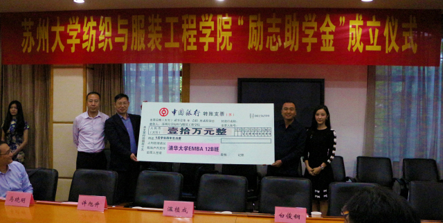 潘志娟代表学院对清华大学EMBA-12级B班情系教育、捐资助学表示感谢,学院将继续做好贫困家庭学生资助工作,解决学生经济困难问题,为每一个贫困学生创造一个美好的明天,为苏大、为社会培养出优秀的纺织行业人才。