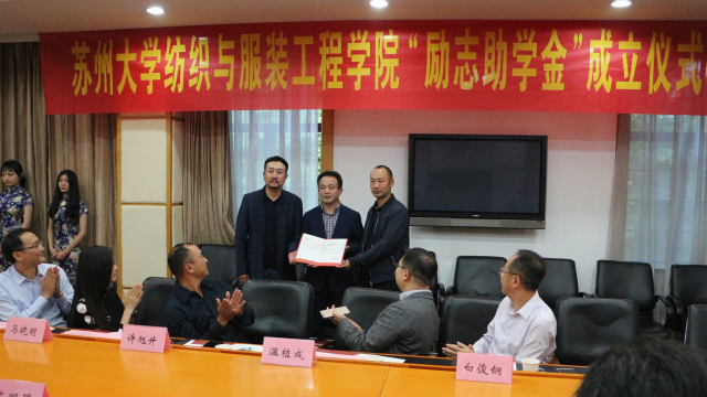 2017年10月27日下午,苏州大学纺织与服装工程学院“励志助学金”成立仪式在我校红楼会议中心201会议室举行。出席本次成立仪式的领导和嘉宾有香港捷迅集团董事长许旭升,香港百骏集团董事、中国社工协会公益委员会常务理事马晓明,同德投资合伙人温植成,安徽中兴继远信息技术股份有限公司董事长徐强,丰电科技集团股份有限公司董事长白俊钢,腾讯公司高级顾问陈发奋,亚港盈通科技发展有限公司董事长邓会波,南京斯坦德云科技股份有限公司董事长胡永生,青岛博海地产集团董事长贾建宇,鄂尔多斯市众和房地产开发有限责任公司总经理李健,广州市玛茜特皮具有限公司总经理殷霆;我校党委常委、纪委书记芮国强,苏州大学学生工作部(处)处长孙庆民,纺织与服装工程学院院长潘志娟,纺织与服装工程学院党委副书记、副院长潘爱华。纺织与服装工程学院党委书记董召勤主持此次成立仪式。