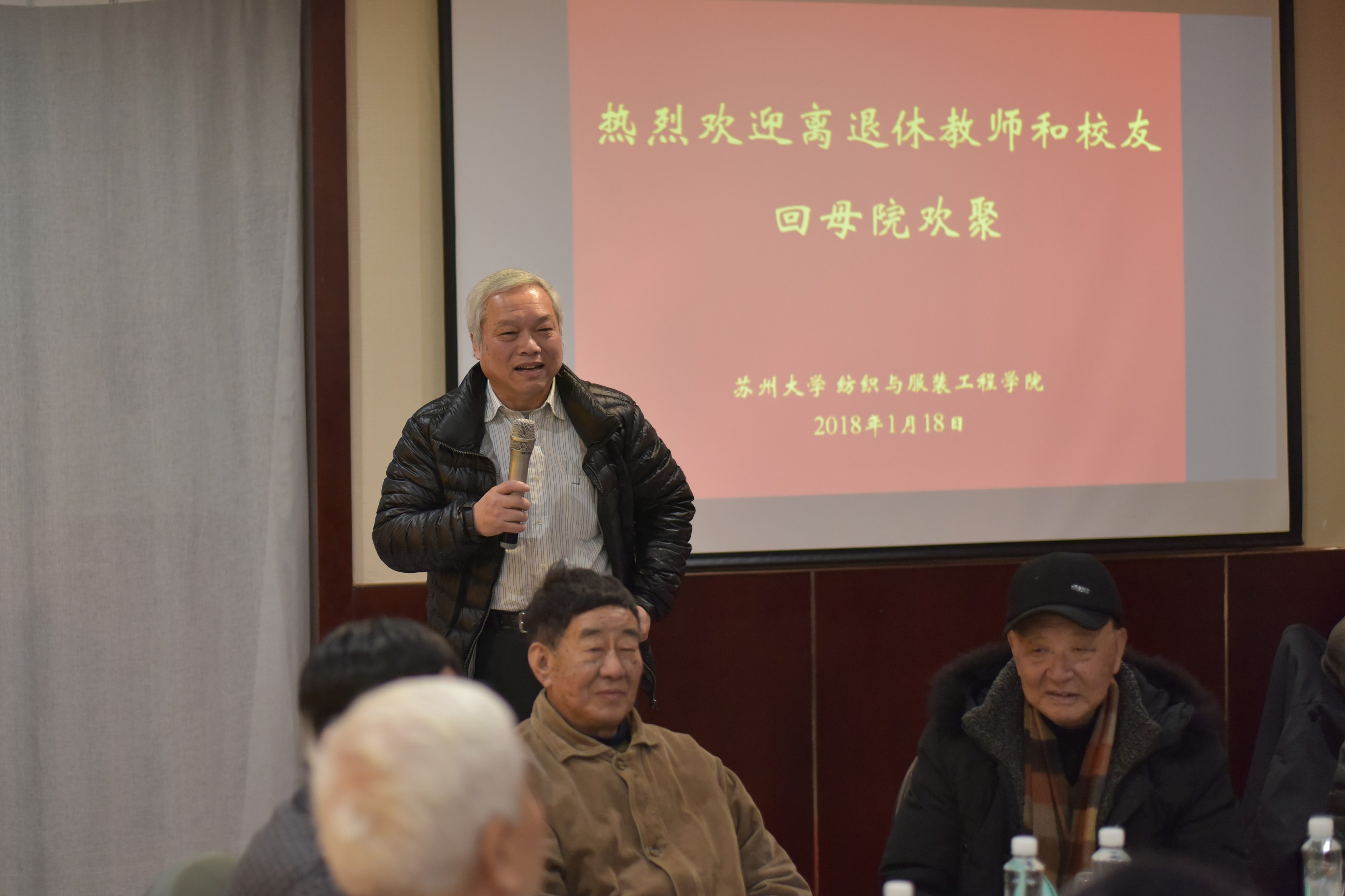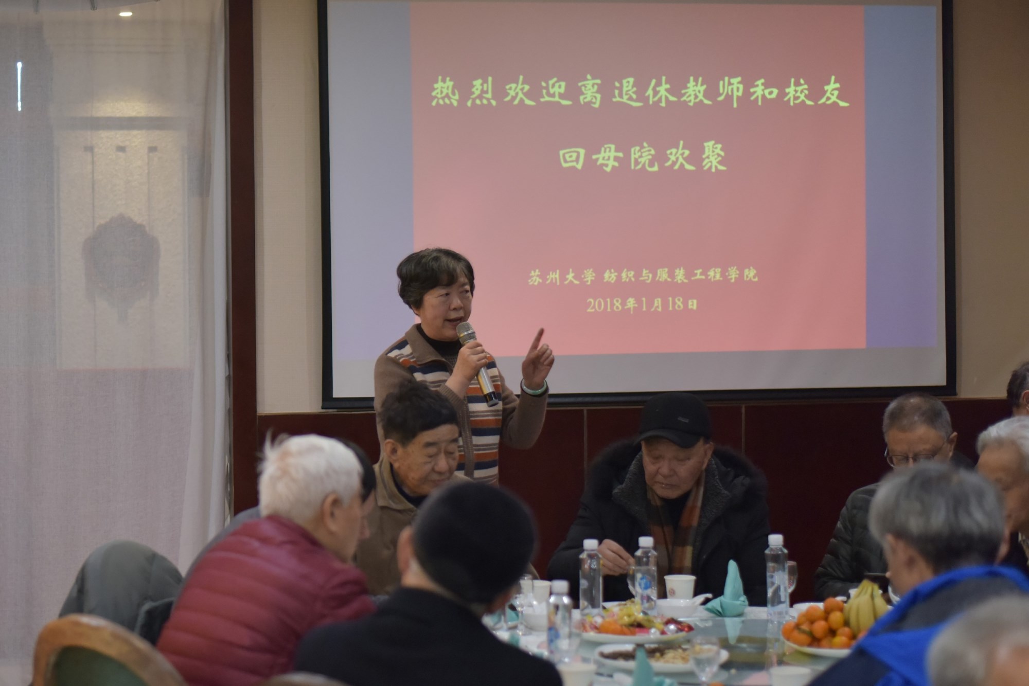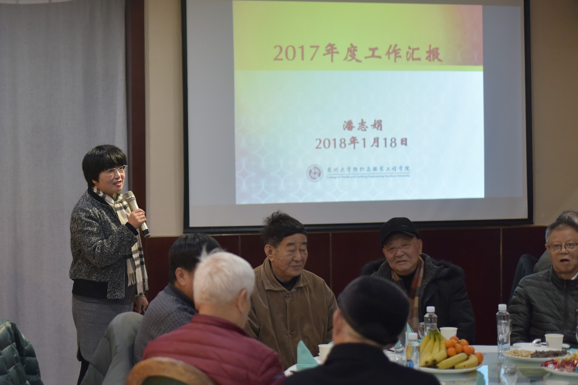 “新年伊始,万象更新”,2018年1月18日上午10时,纺织与服装工程学院离退休教职工迎新座谈会在“万家灯火”会议厅温馨举行。学院党委董召勤书记、潘志娟院长、院工会周正华主席、办公室司伟主任以及校友代表朱品荣、高荣芳、曹志庄同59名学院离退休教师欢聚一堂,共叙苏纺情谊,共话学院发展。座谈会由董召勤主持。