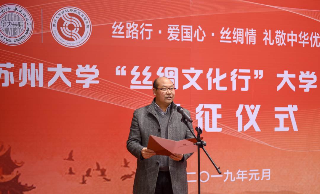 2019年1月12日上午8:30,苏州大学“丝绸文化行”大学生社会实践出征仪式在苏州大学博物馆举行。我校党委常委、副校长刘标,校党委常委、党委宣传部部长、新闻中心主任陈晓强,校学生工作部(处)副部(处)长潘爱华,校团委副书记徐美华,校博物馆常务副馆长冯一,纺织与服装工程学院院长潘志娟,纺织与服装工程学院党委书记董召勤,“丝绸文化行”大学生社会实践总团、各分团、小分队负责人,纺织与服装工程学院专业教师代表、辅导员代表以及本科生、研究生、海外留学生代表参加了本次出征仪式。仪式由纺织与服装工程学院党委副书记、副院长卢永嘉主持。
