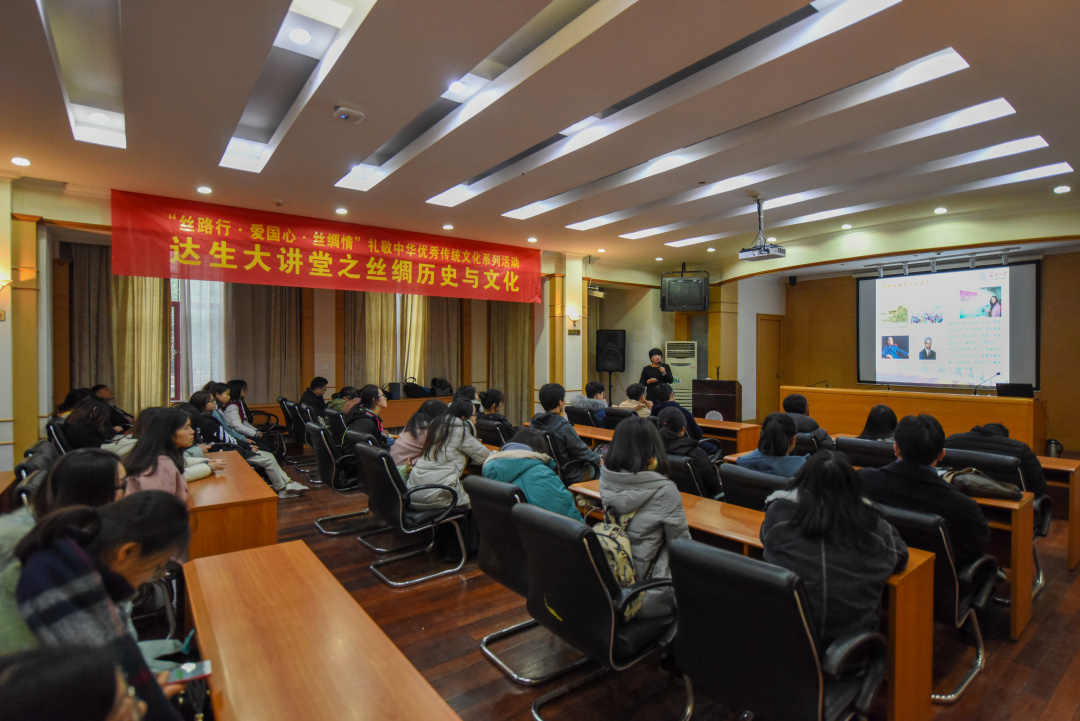 上午9:00,达生大讲堂之丝绸文化讲座在红楼会议中心115会议室举行。潘志娟担任主讲人,她以《丝绸历史与文化》为题,展开了一场关于丝绸之路、丝绸历史遗迹、丝绸非物质文化遗产、丝绸服饰文化的精彩演讲。到场的师生跟随着潘老师的分享,品味了丝绸悠长的历史以及丝绸典雅的文化,受益匪浅。