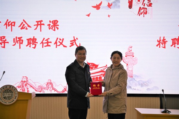 活动伊始,全体人员观看丁香烈士介绍视频。丁香(1910-1932),江苏苏州人,曾在我校主要前身之一的东吴大学学习生物和代数,并与同为东吴大学的生物系学生乐于泓相知相恋。两人一起为五卅运动募捐,一起走上革命道路,一起加入中国共产党,并在组织的批准下结为夫妻。不过,幸福的生活才过了5个月,丁香就因叛徒出卖不幸被捕,并被国民党反动派押解到南京雨花台秘密枪决。乐丁香是乐于泓与第二位夫人的长女。为了纪念丁香烈士,父亲特意为她取名乐丁香。学院特聘乐丁香担任纺织与服装工程学院信仰公开课导师,学院党委书记肖甫青为其颁发聘书。
