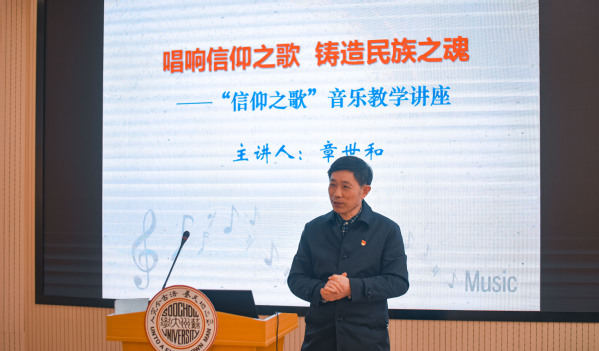 2021年4月13日,苏州大学纺织与服装工程学院(紫卿书院)开展专题音乐党课《唱响信仰之歌 铸造民族之魂》,邀请南京市文联原副巡视员、南京市音乐家协会原副主席章世和主讲。学院党委委员、全体党员、青马工程学员等聆听了党课。活动由学院党委副书记、副院长严明主持。学院特聘章世和担任纺织与服装工程学院信仰公开课导师,校学科建设办公室主任、纺织与服装工程学院(紫卿书院)院长潘志娟颁发聘书。
