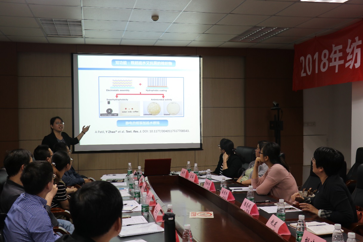 赵燕、张涛、刘帅作为青年代表分别就自己研究方向和成果进行了讲座汇报。赵燕报告了织物表面功能化技术和应用,通过不同的响应条件,实现了表面亲疏水/油的转换,并在报告中提出了非常规的沉积银方式实现表面抗菌性的效果。这份新颖的报告引来的大家积极的讨论。张涛报告了基于乳液模板法的纤维化多孔聚合物,介绍了亲水性的多孔聚合物,具有较好的应用前景。刘帅报告了低温等离子体在纺织领域的应用,叙述了等离子体在喷气织造中、在后整理中、在纺织清洁生产上的应用,报告全面有逻辑,得到大家广泛认同。