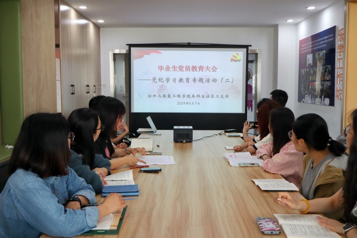 为加强毕业生党员教育,6月7日,纺织与服装工程学院(紫卿书院)本科生社区第二党支部在紫卿书院双创会议室召开毕业生党员教育大会,支部书记季彦斐、副书记杨洋、组织委员兼纪检委员吴菲非及全体党员参加会议,会议由季彦斐主持。