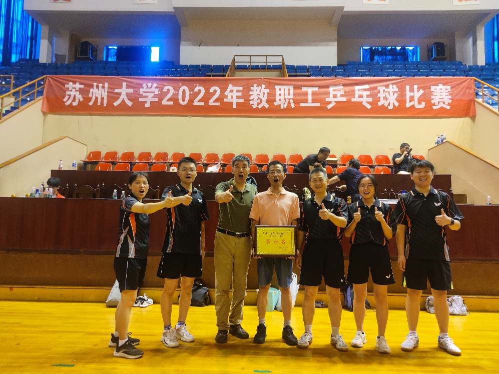 9月17日,苏州大学2022年教职工乒乓球团体比赛决赛在东校区体育馆举行,来自全校26个代表队参加了比赛,经过全天的激烈角逐,我院代表队在本次比赛中突破历史,荣获团体第六名。