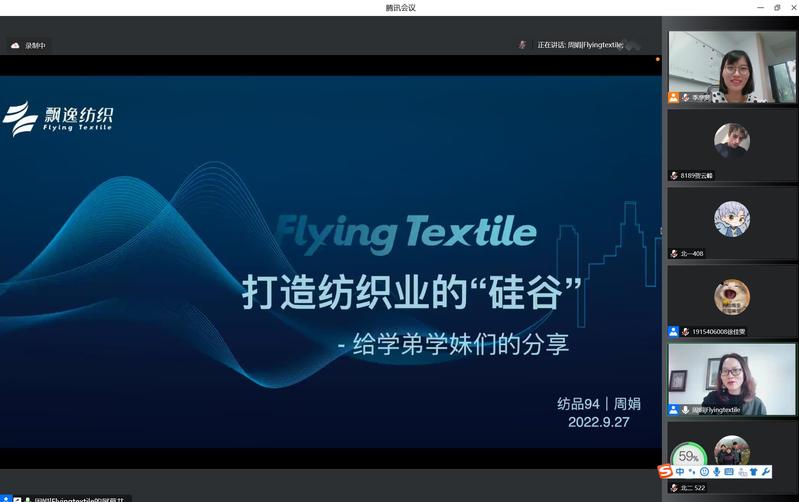 吴江市飘逸纺织有限公司创始人、苏州唯逸纺织科技有限公司创始人、苏州风谜网络科技有限公司创始人、纺织无边界合作联盟创始人、国家高级面料设计师,校友周娟从自身经历出发,向同学们讲述了如何打破行业与企业边界,融合科技与时尚,最终实现“纺织无边界”的行业共生生态链。以“科技创造更美好的穿着体验”的理念打破了同学们对纺织服装行业的传统刻板印象。