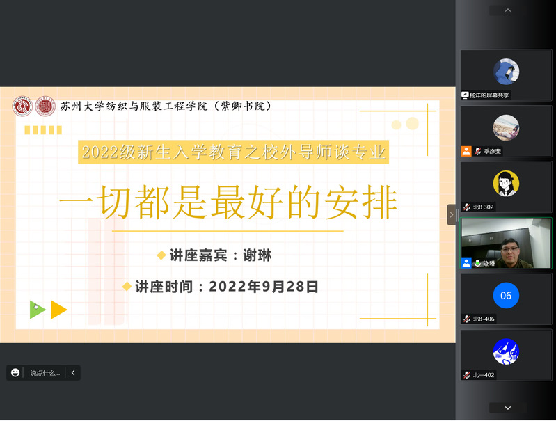 新生入学教育是本科生培养的重要内容,旨在引导广大新生开好头、起好步,坚定理想信念,以饱满的精神、奋进的姿态投入新学期的学习生活。纺织与服装工程学院(紫卿书院)于9月26日至9月28日开展“2022级新生入学教育之校外导师谈专业”系列活动,共邀请五位杰出校友、行业精英参与分享,为新生们献上了干货满满的开学礼物。