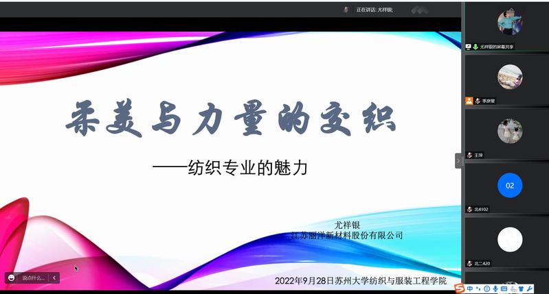 江苏国泰国华集团总经理、苏州大学服装设计与工程2006届校友孙凌作了题为“纺织链接世界”的讲座,她结合自身工作经历向同学们介绍了目前纺织服装行业的生产、贸易现状,以及行业未来的发展趋势。孙凌指出纺织服装作为人们日常生活的大众消费品,正以“绿色、可持续”的发展理念,在缤纷多彩的数字化平台上,联通着世界的每个角落。