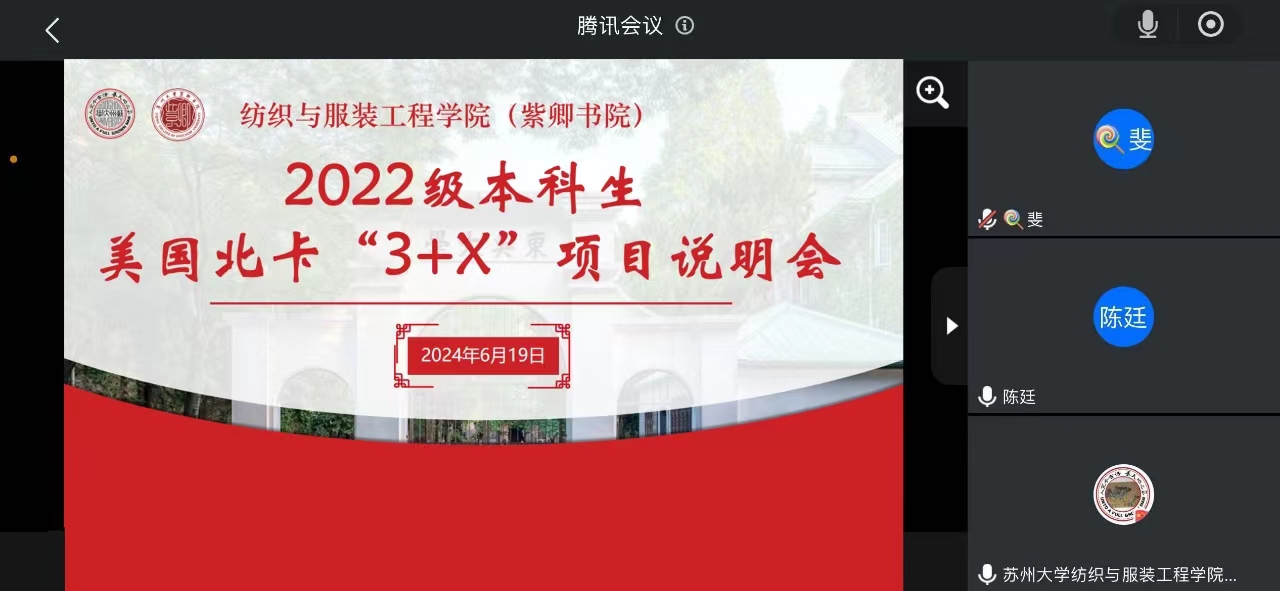 为帮助学生和家长全面了解出国(出境)学习交流项目,提供多元化的高质量升学路径,6月19日晚,纺织与服装工程学院在线上召开美国北卡“3+X”项目说明会,学院副院长陈廷,党委副书记、副院长虞岚,非织造材料与工程系教授赵荟菁,学工办主任、22级本科生辅导员季彦斐以及部分学生和家长代表参与。会议由季彦斐主持。