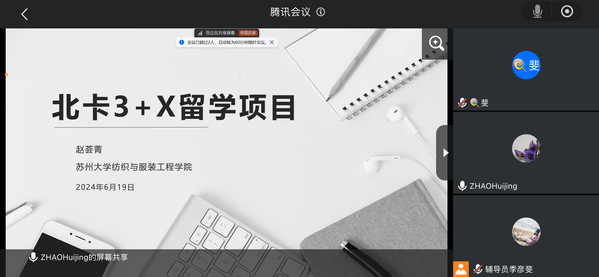 之后,赵荟菁详细介绍了美国北卡“3+X”项目的背景、招生对象、申请要求、报名流程、费用情况等内容。她指出北卡罗莱纳州立大学是一所著名公立研究型大学,该校纺织学科排名全美第一,在师资力量、教学设施、地理位置等方面有着优越的条件。同时,赵荟菁还详细分析了学院近几年录取情况,重点强调了学生派出前需要完成的学习内容以及提前应做好的准备等注意事项。在听完介绍后,学生和家长们对该项目有了深入的了解,并在线上进行了积极互动,针对费用预估、报名的条件限制、具体的学习方式、入学时间等内容提出疑问,与会领导和老师进行一一解答。