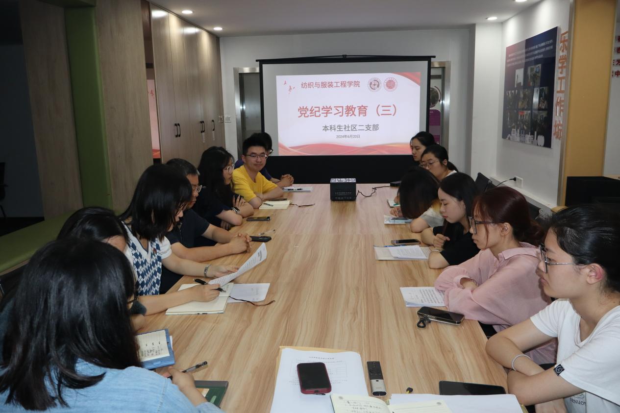为全面贯彻落实习近平总书记关于加强党的纪律建设的重要论述和关于党纪学习教育重要指示精神,进一步激励毕业生党员提高政治站位,坚定理想信念,牢记党员身份,永葆党员本色。2024年6月21日,纺织与服装工程学院本科生社区二支部在社区会议室开展党纪学习教育2024届毕业生党员“最后一堂党课”。学院党委书记肖甫青,本科生社区二支部支部书记季彦斐、副书记杨洋、组织委员兼纪检委员吴菲非及全体党员参加会议,会议由季彦斐主持。