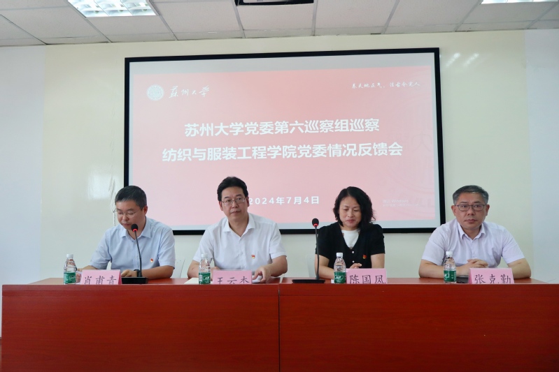 根据苏州大学党委第三轮巡察工作部署,2024年7月4日下午,苏州大学党委第三轮巡察第六巡察组巡察纺织与服装工程学院党委情况反馈会议在北校区工科楼619召开。校党委常委、组织部部长、第六巡察组组长王云杰,第六巡察组副组长陈国凤以及第六巡察组全体成员,纺织与服装工程学院全体教职工参加了会议。会议由纺织与服装工程学院党委书记肖甫青主持。