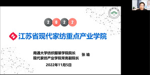 教育部高等学校纺织类专业教学指导委员会委员、南通大学纺织服装学院院长张瑜教授以“江苏省现代家纺重点产业学院”为题,从建设背景、专业融合、联合共建、发展定位、建设思路等方面介绍了产业学院的总体概况,分享了产业学院在人才培养、校企合作、实训基地、管理体制及保障体系等方面的建设经验及成效。