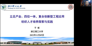 浙江理工大学纺织科学与工程学院院长于斌教授从浙江省纺织产业特色与优势以及纺织人才培养存在的问题入手,介绍了产教融合实体研究院在人才培养中的作用,重点分享了高端纺织人才与国际创新人才的培养举措。