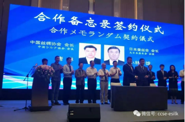 中国丝绸协会会长唐琳与日本蚕丝会会长小林芳雄签订合作备忘录。